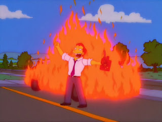 Diane runs off with the girls following. She tells them only that she hates fire, but they both think she's just overreacting. It's not like that's a viable phobia or anything. Everyone goes to class and things are being rather dull until Jill smells smoke. The fire alarm hits and the kids exit as the fire is seen from the library. Turns out that Andrew threw Diane's burnt folder into a trash can, which wasn't put out properly. So far, this book is less horror and more a PSA on fire safety. All we're missing is Gilbert Gottfried as Seymour Smoke. Jill, Andrea, Max, Nick and Diane talk about the fire. It's bothering Diane, but again the others are all like "What's your problem?"